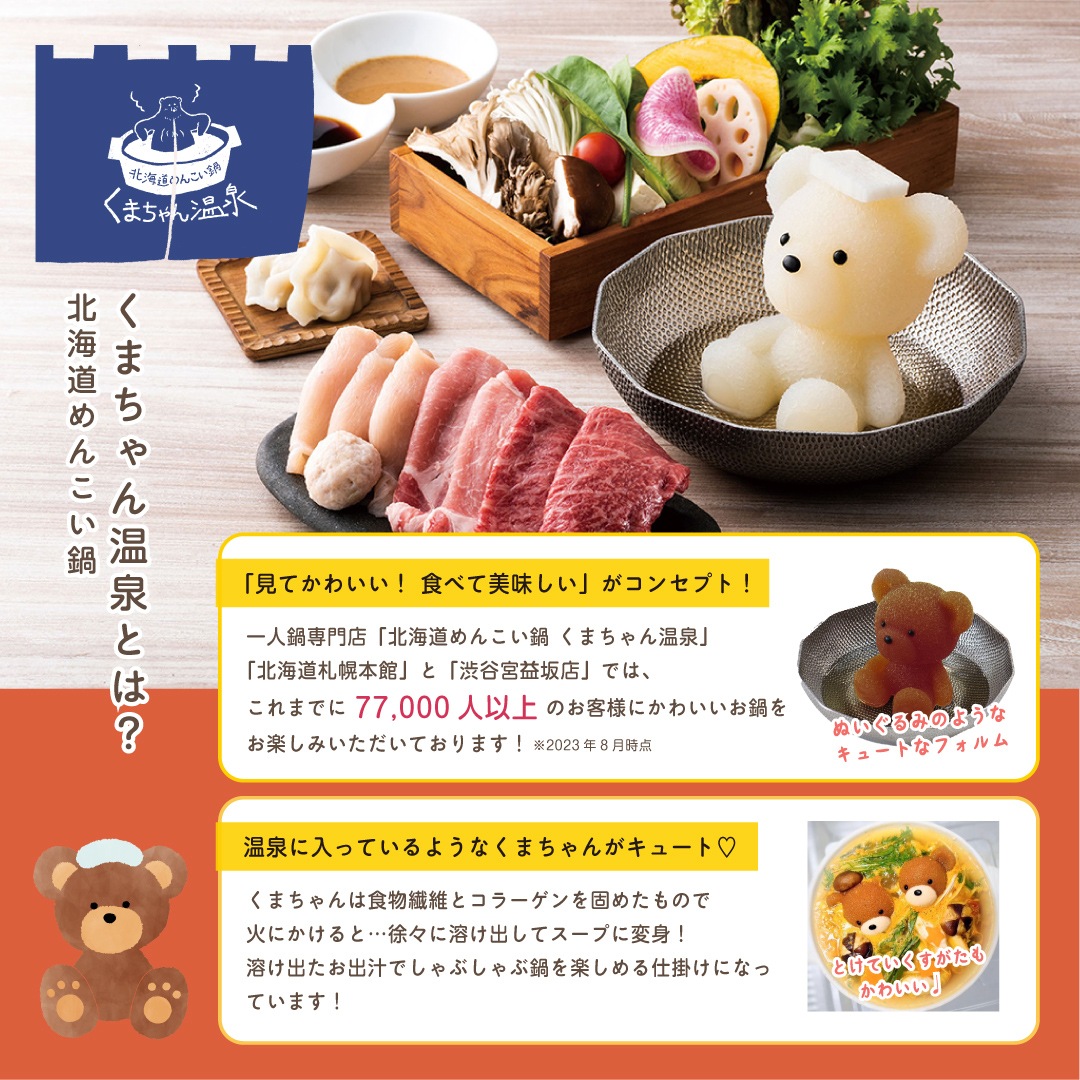 お肉付きの「北海道めんこい鍋 くまちゃん温泉」が登場!北海道産牛肉を使った特別セットで、人気の「出汁醤油風味の茶くまちゃん」か「豆乳醤油風味の白くまちゃん」を選べます。ペアくまちゃんで3~4人前の鍋が楽しめ、贈り物や鍋パーティーにも最適です。