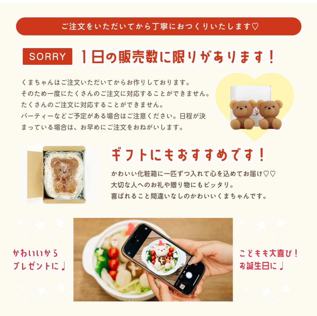 ※くまちゃんはゼラチンスープでできておりますため、日が経つごとに水っぽくなり形が崩れていく可能性がございます。