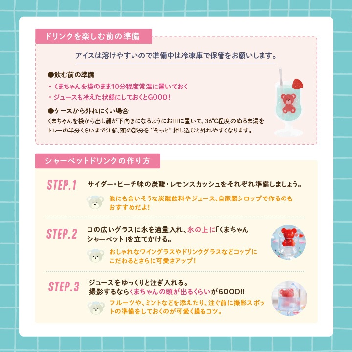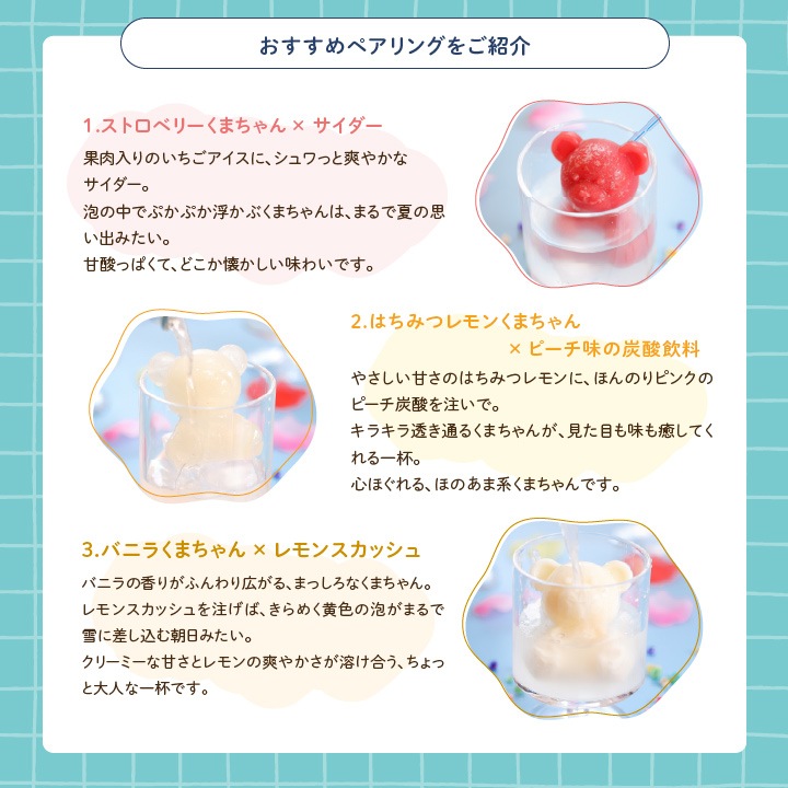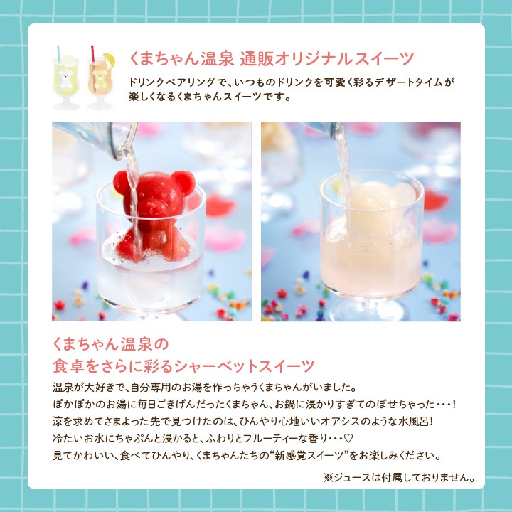 グラスに座らせたくまちゃんにジュースを注いで崩しながらたべる、かわいい見た目とちょっぴりシュールな新感覚の体験をお楽しみください!