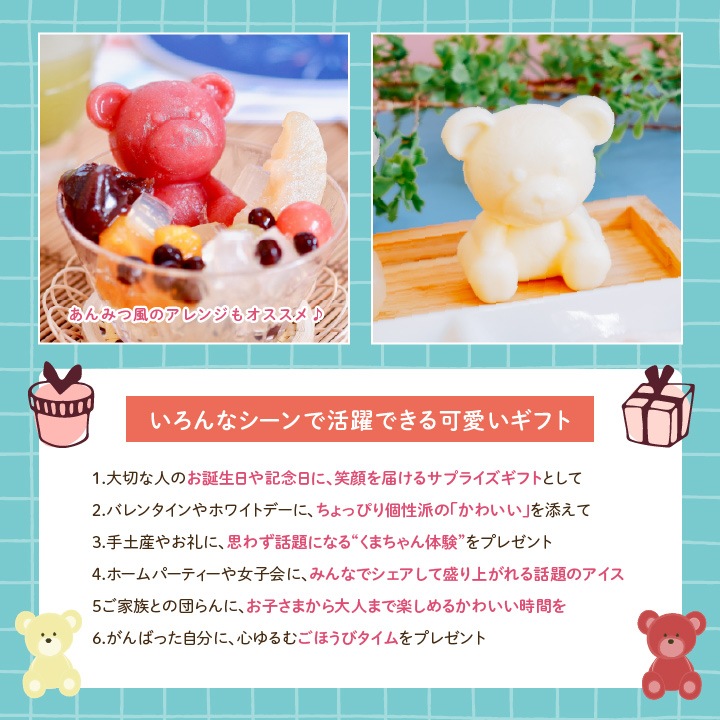 ドリンクとペアリングしてほしいバニラ / はちみつレモン / ストロベリー3種類のくまちゃん型アイスをかわいいギフトボックスに入れてお届け!